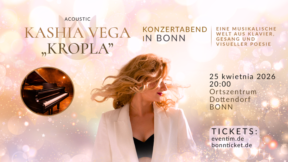 Ortszentrum Dottendorf Dottendorfer Str. 41, Bonn, NRWKASHIA VEGA – "KROPLA" Acoustic / Stille & Kraft Tauchen Sie ein – Musik über Wandel & Stärke Am 25. April lädt Kashia Vega, Singer-Songwriterin, Komponistin und Pianistin zu einem besonderen Konzertabend in Bonn ein, in dem sie ihre eigene musikalische Welt erschafft. Mit Klavier und Gesang entsteht eine intime Klangwelt, in der Musik, Emotion …